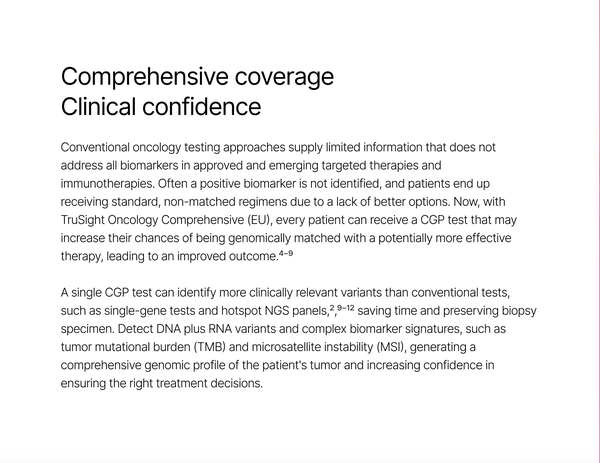 I partnered with Illumina's TruSight Oncology product team and a visual designer to craft the voice and tone for a new product brochure. I communicated a message of empowerment and positive progress, focusing on how we are making genomics useful for all while creating the future of cancer testing.